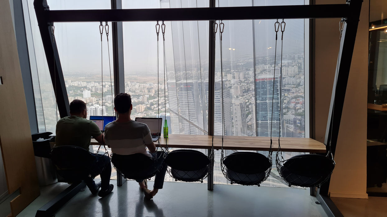 overlooking the breathtaking view of the Tel Aviv skyline, these offices on the 58th floor house one of Israel’s most influential and innovative startup companies. Designed to serve as a versatile workstation and a serene spot for relaxation, this bench invites employees to engage their imagination and embrace a sense of innovation. With its suspended wire seats, angular geometry, and a sleek oak bar top, the bench exudes a vibrant energy that embodies creativity and forward-thinking. Whether used for work or taking a break, this piece is a visual testament to imagination and innovation.
